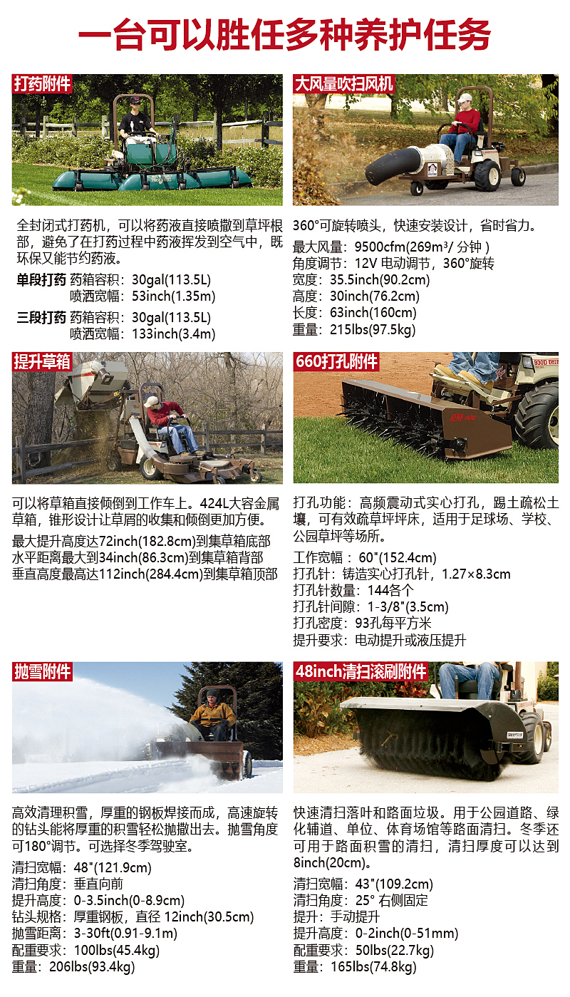 多種功能附件可供選擇:收草、梳草、切邊、密閉打藥、打孔、風機、遮陽篷等。