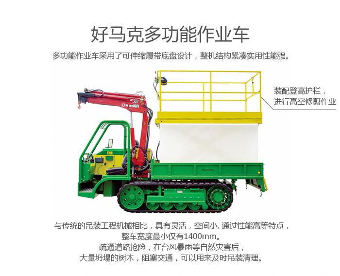 多功能作業(yè)車采用了可伸縮履帶底盤設(shè)計(jì),整機(jī)結(jié)構(gòu)緊湊實(shí)用性能強(qiáng)。與傳統(tǒng)的吊裝工程機(jī)械相比,具有靈活、空間小、通過性能高等特點(diǎn),整車寬度最小僅有1400mm。同時,履帶式底盤對地面的要求也很低,不用考慮地基的要求。