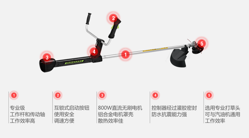 GREENMAN 電動(dòng)割灌割草機(jī)從國內(nèi)綠化管理的實(shí)際情況出發(fā),選用800W大功率直流無刷電機(jī)和大直徑打草繩。在實(shí)現(xiàn)電動(dòng)化的同時(shí),又能滿足綠化養(yǎng)護(hù)的高效率。