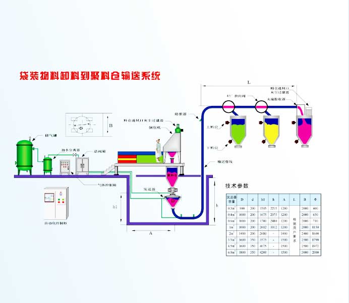 1.袋裝物料卸料到聚料倉輸送系統(tǒng):